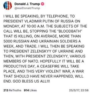 美国总统特朗普在其社交媒体发言称将于周一上午10点与俄罗斯总统普京通话,主要议题是讨论停止俄乌冲突以及贸易问题。 然后将与乌克兰总统泽连斯基交谈,并会同泽连斯基与北约各成员国通话。 特朗普强调冲突 “本不应发生...