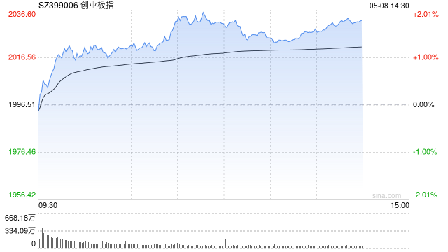 5月8日消息,指数早盘低开高走,创指、深成指半日涨超1%。板块方面,军工概念延续涨势,航飞方向领涨,华伍股份20cm涨停,豪能股份(维权)、利君股份等盘中涨停;脑机接口概念强势,东方中科、荣泰健康等涨停;光伏设备板块走强,高测股份20cm涨停;PEEK材料陷入回调,中欣氟材盘中跌停;农业股集体调整,种植方向领跌,秋乐种业跌幅居前;公路铁路运输板块走弱,大众交通、锦江在线领跌。总体来看,个股涨多跌少,上涨个股超3800只。