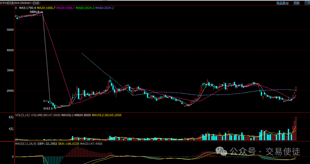 对于后面走势我们认为:关税减免幅度远超市场预期,叠加欧美传统运输旺季临近,货主企业出于降低关税成本和赶工交货的双重考虑,可能集中启动“抢运”操作,短期内亚欧、跨太平洋航线货量或现脉冲式增长。策略上,短期我们建议近月06和08合约保持调整做多思路,同时可空配2510合约,基于10月的淡季属性和此轮关税缓和对10月的实质性影响有限。