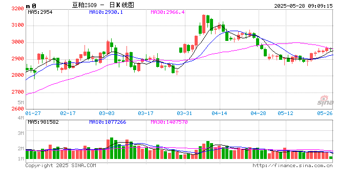 同期,豆粕期货主力合约也出现两波显著的上涨行情。文华财经数据显示,截至5月27日收盘,豆粕期货主力合约报2966元/吨,今年以来累计上涨4.69%。