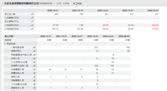 作为分管投行业务的副总裁,袁玉平的离任与方正投行面临的严峻挑战密不可分。2024年,方正证券公司业务明显分化:财富管理业务和投资与交易业务成为主要增长引擎,2024年收入分别达56.64亿元和24.96亿元,同比分别增加12.84%和127.88%。而投资银行业务出现亏损,营收较上年同期下滑270.06%,成为公司主要业务板块中唯一亏损的部门。今年一季报数据同样不容乐观,投行业务手续费净收入2484.30万元,较去年同期的3790.91万元,下降34.47%。人员流动方面,方正证券承销保荐有限责任公司2024年底从业人员277名,2025年中报降至222名,减员比例高达19.86%。