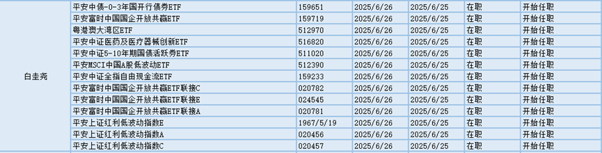新生代白圭尧在加入平安基金仅一个月后,两天时间便火速接管9只ETF产品。而与其形成鲜明对比的,是资深老将钱晶从3只产品的悄然退场。6月25日至26日,平安基金连续两日发布公告,12只基金密集调整基金经理,这场覆盖固收、权益、被动投资等多条业务线的人事迭代,将入职仅一个月的新锐白圭尧推至台前。