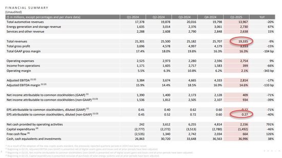 美东时间4月22日周二美股盘后,特斯拉公布2025年第一季度财务业绩。