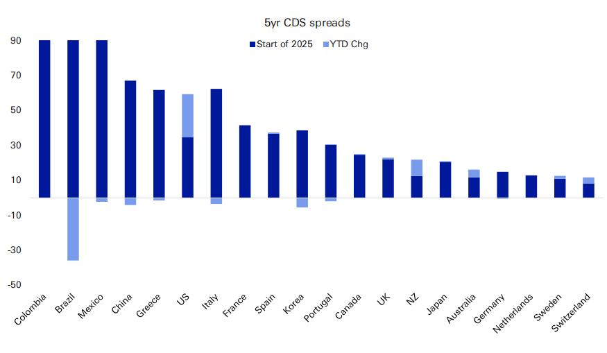 德银强调,美国信用违约互换(CDS)息差上个月跃升了15个基点,达到2023年债务上限担忧和穆迪降级以来的最高水平,目前接近希腊和意大利的水平。而其他主要发达国家的信用风险并未出现类似增加。